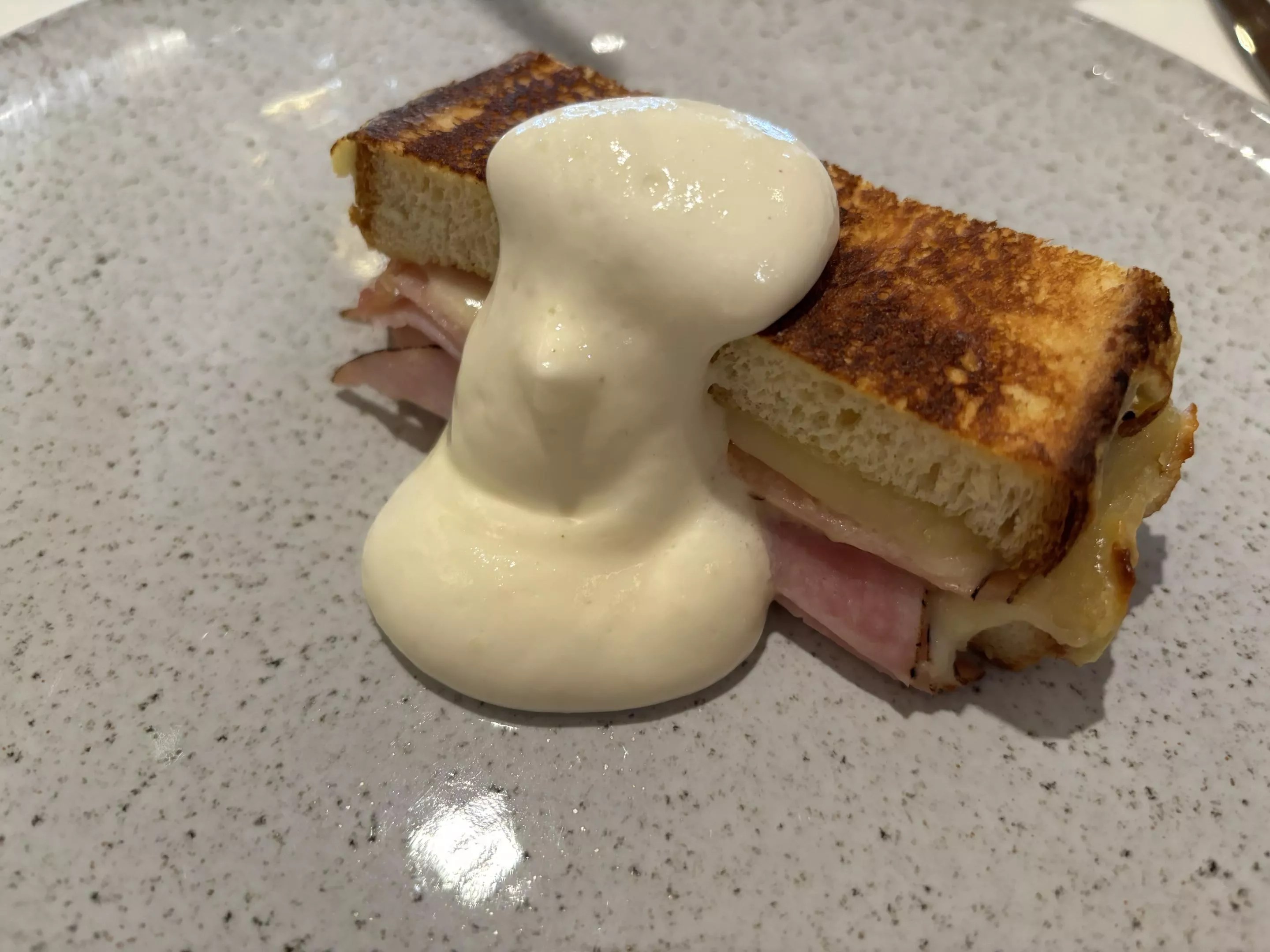 The Monte Cristo course is next. This slice of a sandwich comprises toasted Noble bread, ham, cheese and mornay, a bechamel sauce enriched with grated cheese. On a physical level, it’s a small ham and cheese sandwich. But the salty and savory flavors are crowd-pleasers. However, it could benefit from something sweet or acidic to cut through the creaminess.