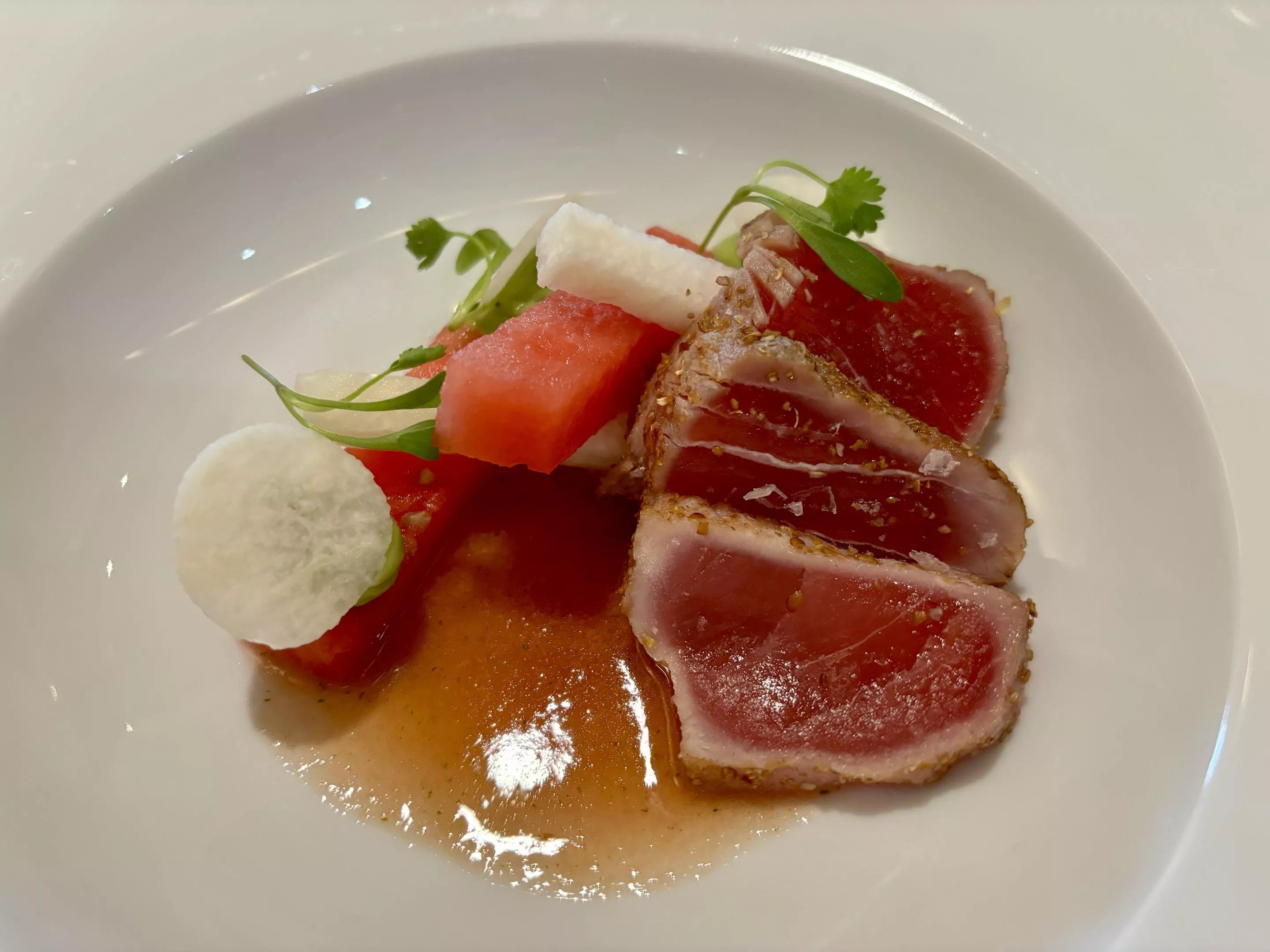 The second course on Morning Would’s menu includes coriander-crusted tuna, watermelon, jicama, avocado, lime and cilantro.
