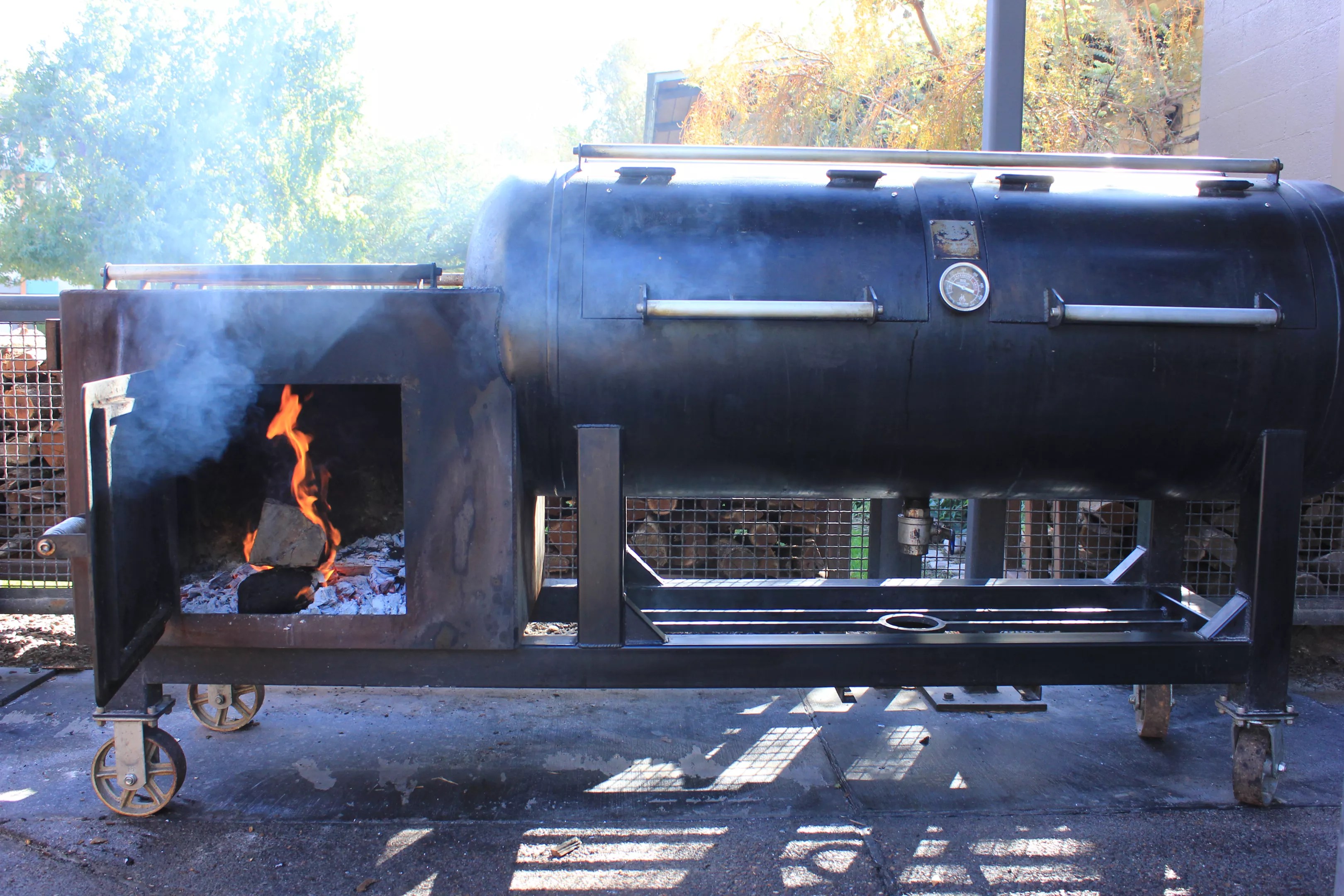 A 500-gallon FatStack smoker salvaged from a Mexican propane tank