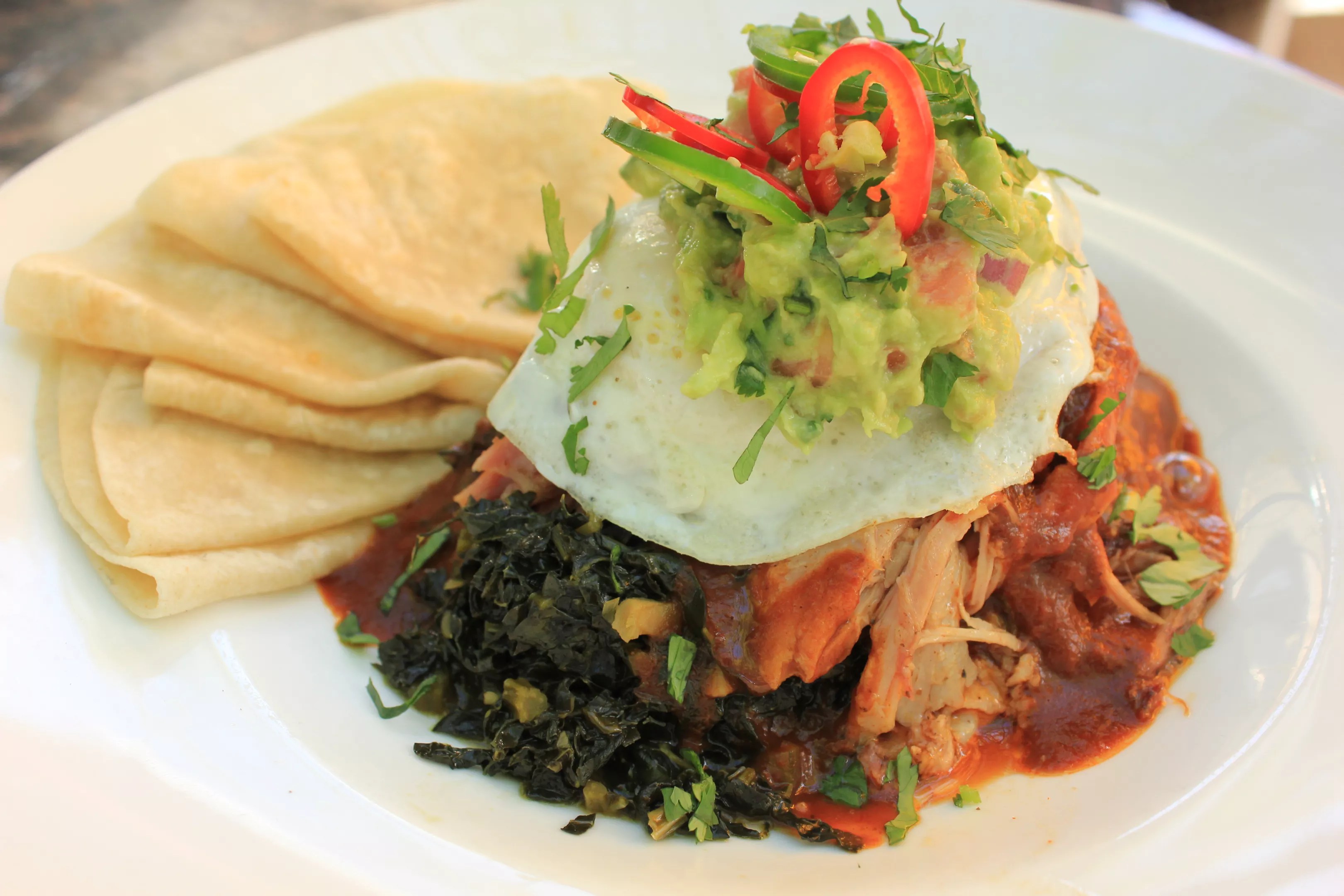 Carne Adovada with a fried egg, guac, braised kale, and flour tortillas