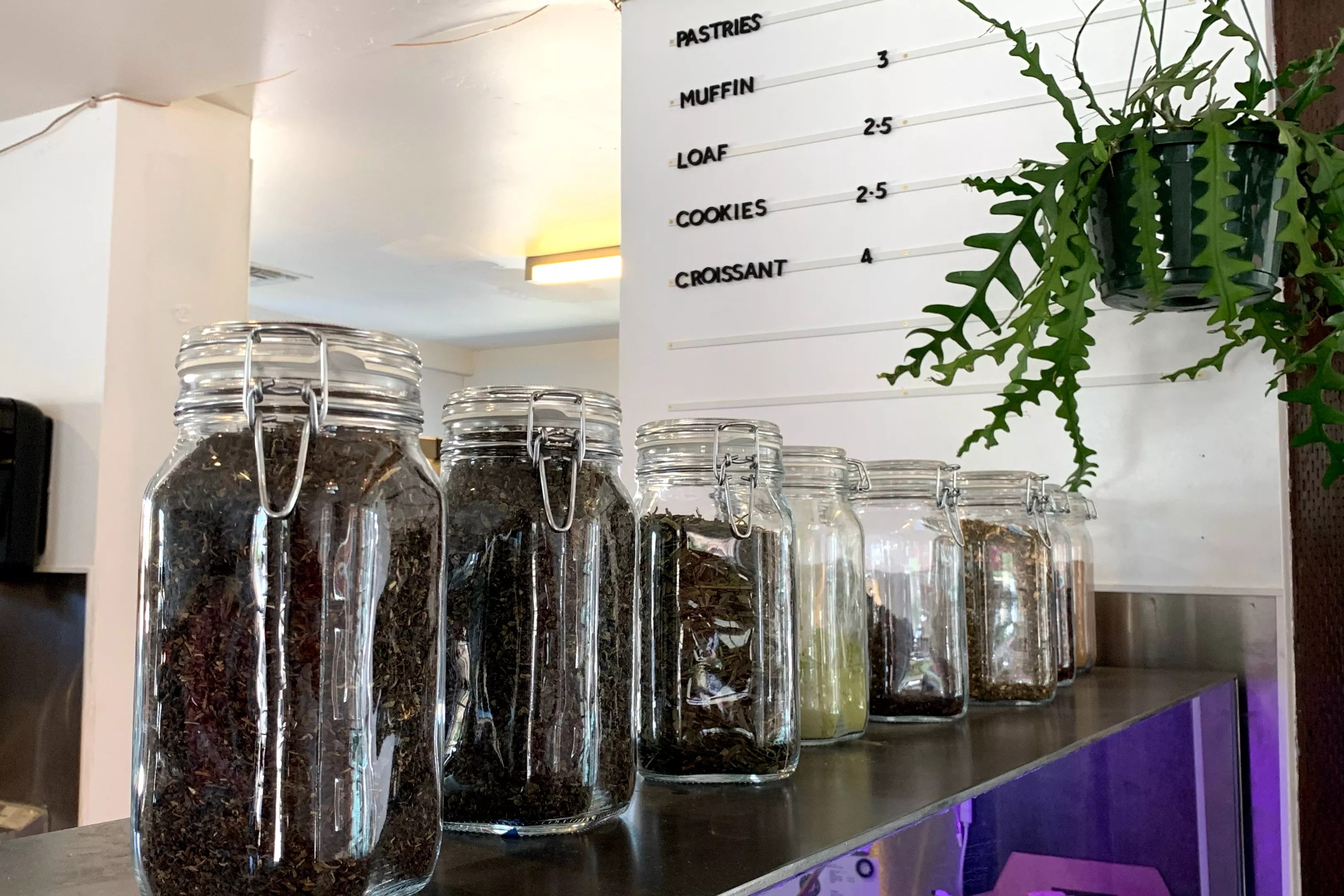 Inside Xanadu Coffee Co., jars of loose-leaf tea stand at attention on the counter. A sign reads: “Hold the tip. Our prices are all-inclusive, so we don’t accept tips. We appreciate the sentiment.”