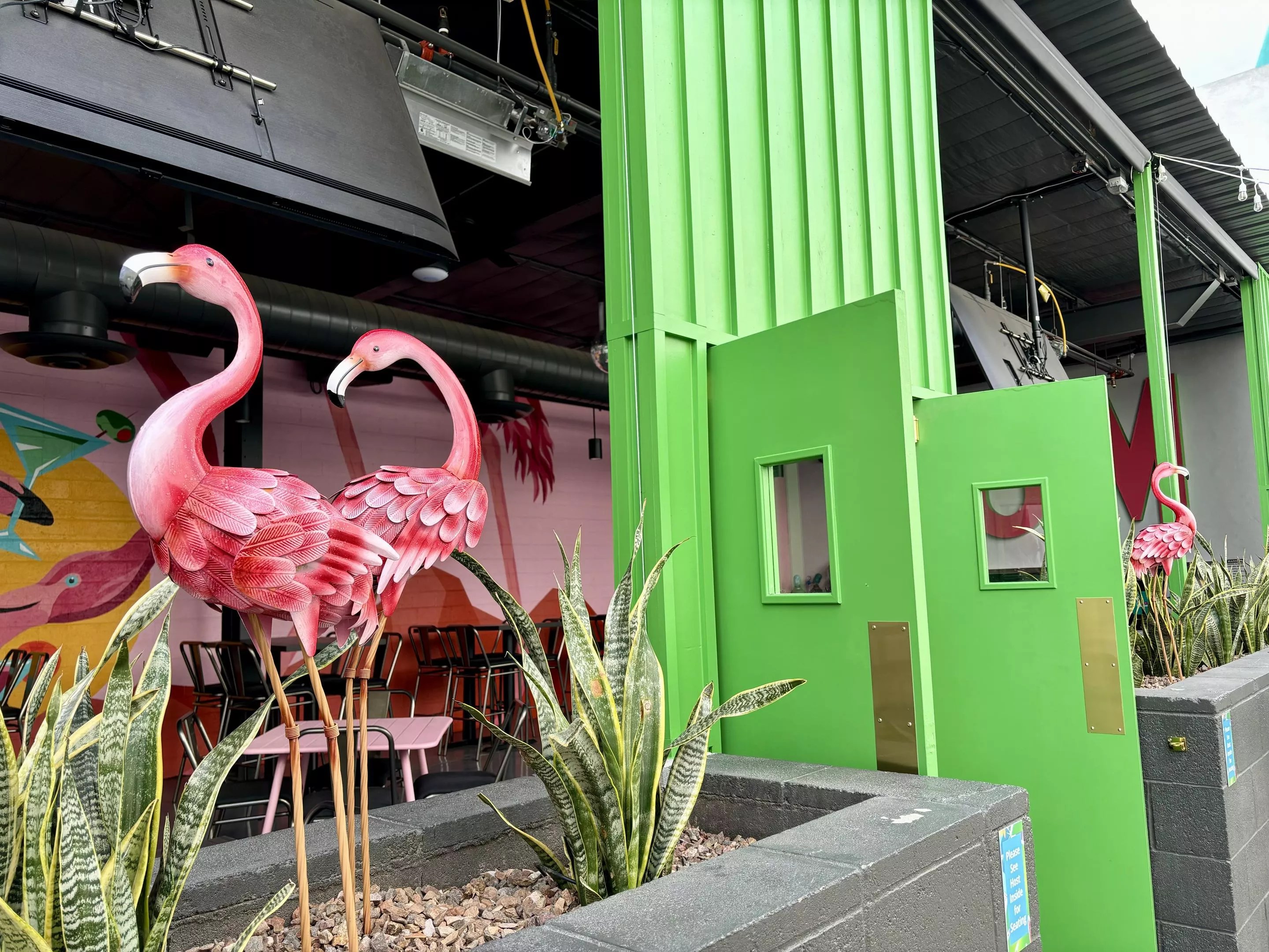 A large covered patio sits just across from the main dining room and features a pink flamingo theme.