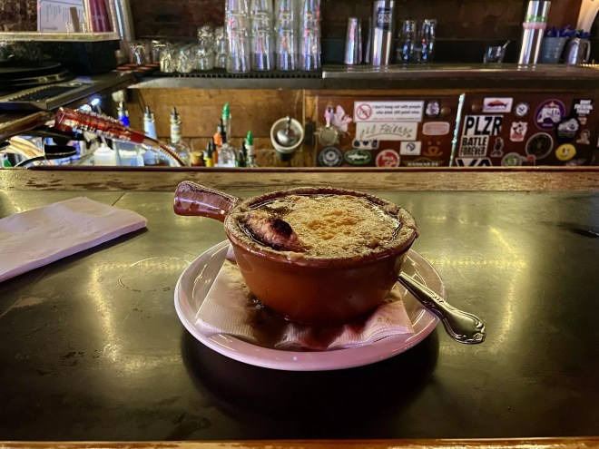 Though oysters are advertised in the name, in-the-know regulars tend to gravitate toward a different menu item: the French onion soup.